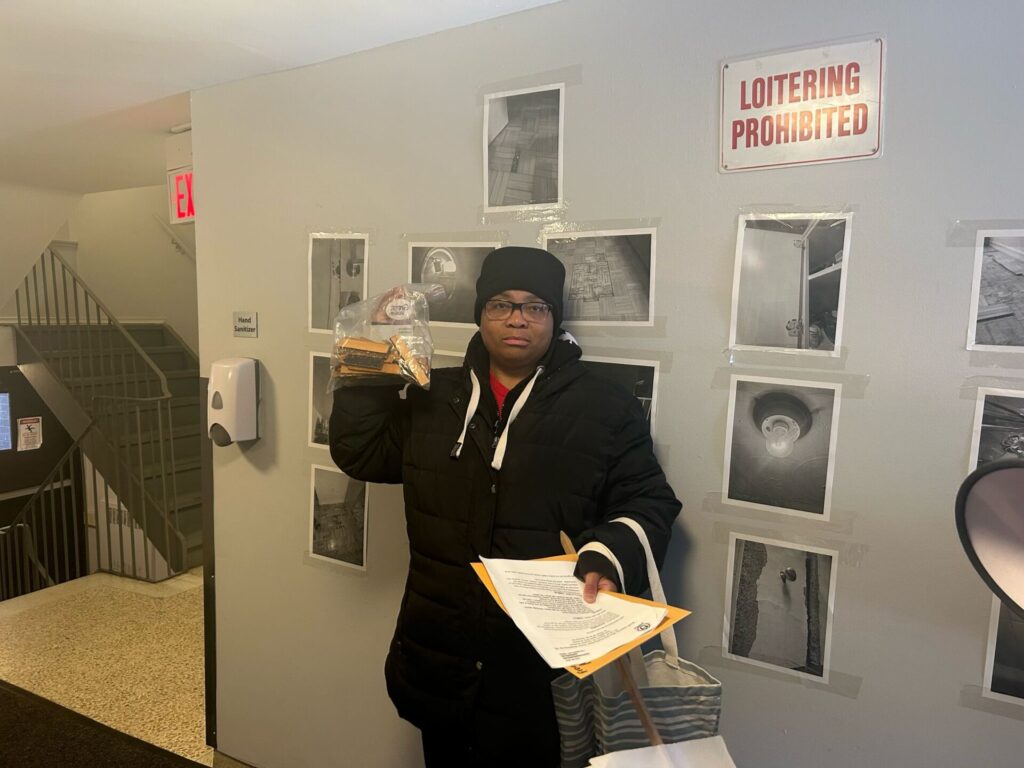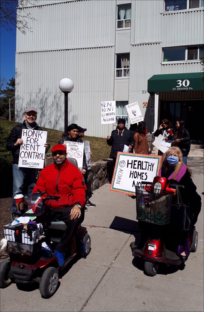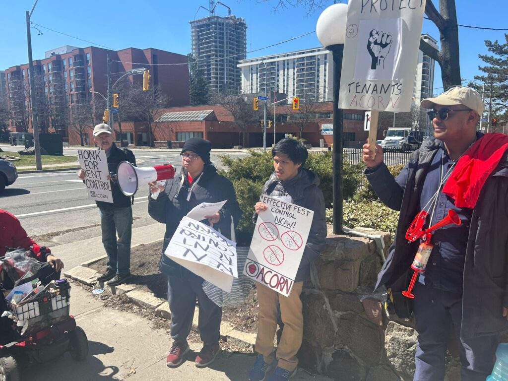16 ACORN members took over the buildings at 30, 32, and 34 St. Dennis Drive, fighting for repairs and effective pest control at their homes, as well as the recent above-the-guideline rent increase that they received because of the landlord’s neglect towards the buildings. We met in front of 32 St. Dennis Drive and then marched to management’s office at 30 St. Dennis Drive to deliver a letter demanding real pest control, safety in the buildings, repairs addressed in a timely manner, proper maintenance protocol, effective fix of the floors, among other things. Additionally, we deliver some of the floor tiles that have been coming off in a tenant’s unit!! We also had a “Wall of Shame” at the building to showcase the unsafe conditions of the tenants’ homes. Jon Burnside (Councillor of Don Valley East)’s staffer came out and took notes of the precarious conditions of the buildings! Attached are pictures of the “Hall of Shame” and the members who are fighting back!