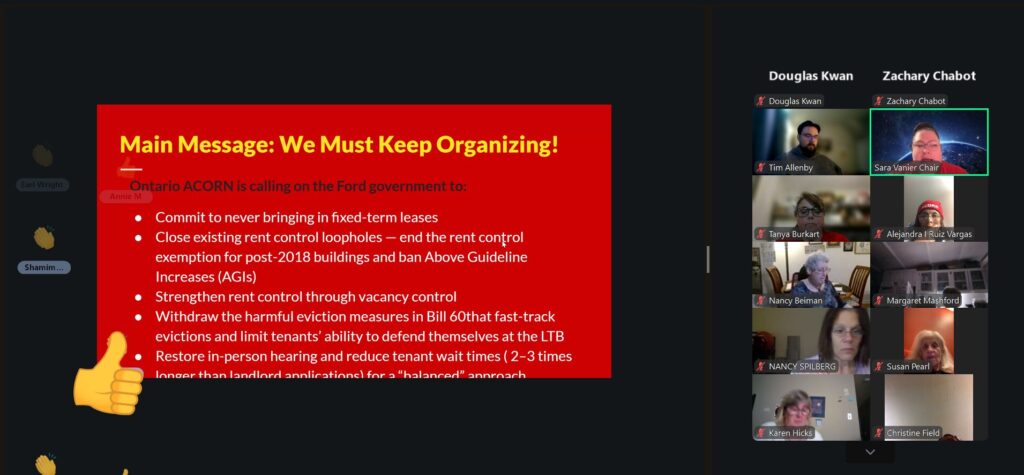 “Hello my name is __ and I’m an Ontario resident and supporter of the ACORN Tenant Union. While the announcement to explore removing rent control through fixed term leases has been walked back, I don’t believe that’s enough. ACORN is demanding the Province commit to never introducing fixed term leases, close the current loopholes on rent control, pass vacancy control, withdraw Bill 60 and rebalance the LTB for tenants – not just landlords. To discuss more, call (say your # or ACORN’s 613 746 5999 ext 3)