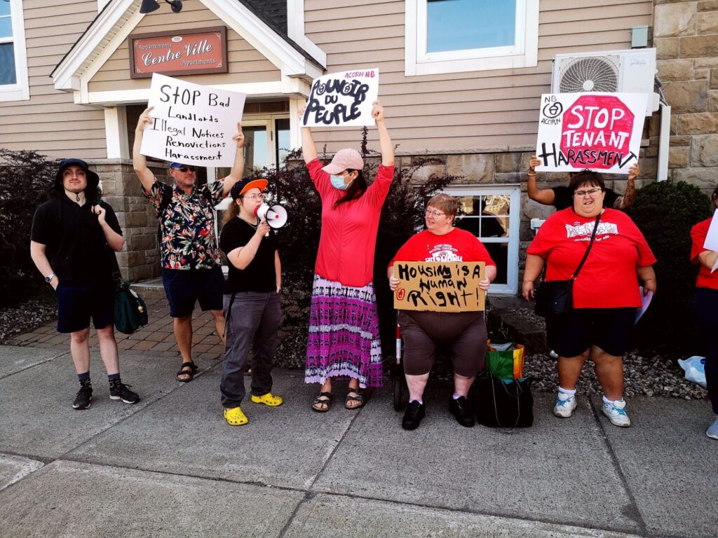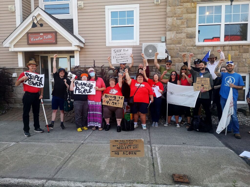 Les membres et les alliés à Moncton se sont rassemblés AUJOURD’HUI (le 17 septembre à midi) pour dire que le harcèlement des locataires et les rénovictions illégales, C’EST INACCEPTABLE !