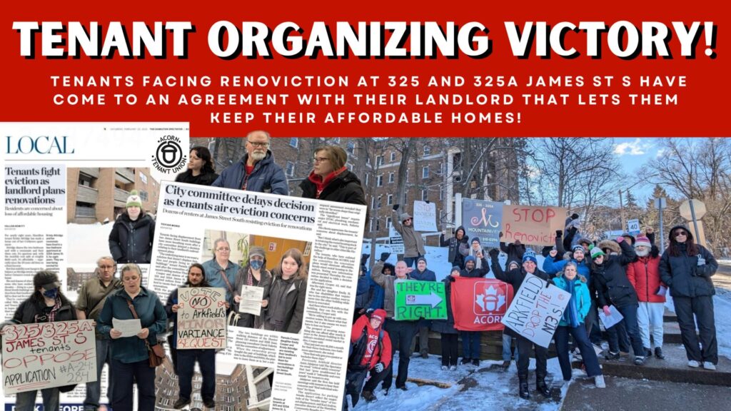 In an extraordinary tenant organizing victory, a group of tenants facing renoviction at 325 and 325A James St S in Hamilton were able to come to an agreement with their landlord that allows them to maintain their affordable homes!