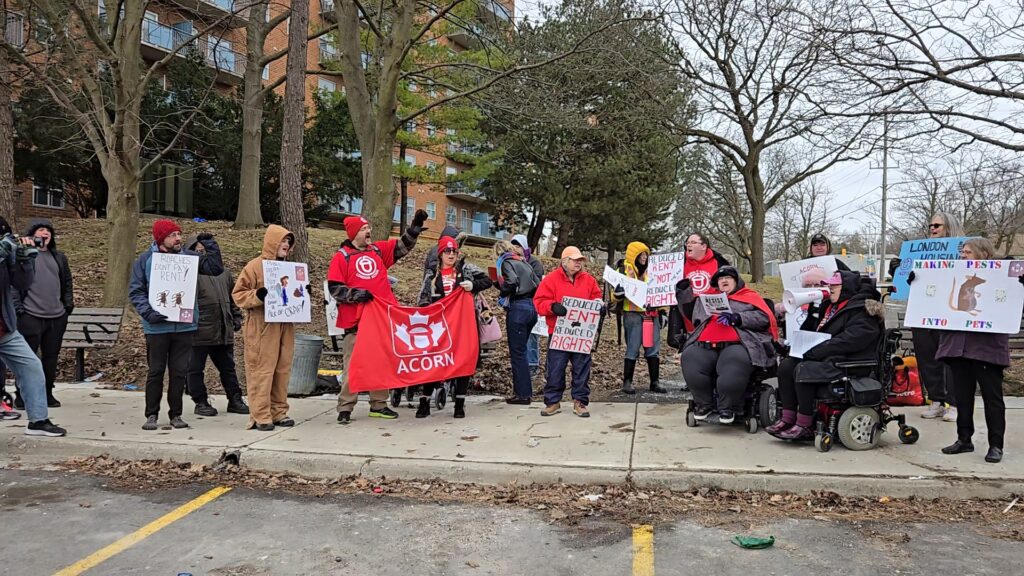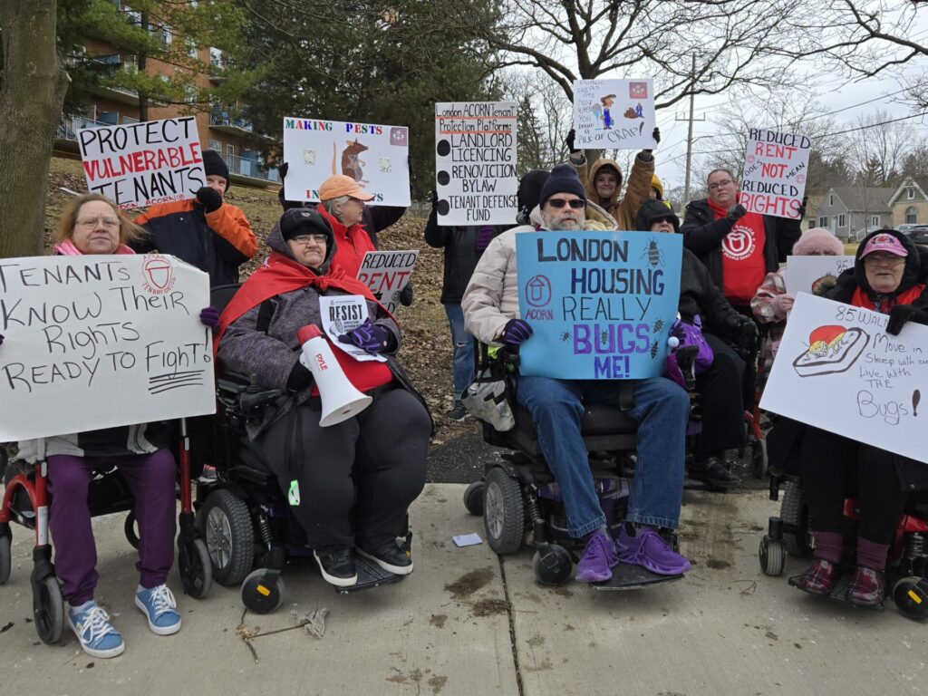 Today’s rally outside 85 Walnut was one for the history books!! With LOADS of media attention from nearly every agency in the city – London Free Press, CTV, CBC, 980CFPL, and the Gazette – over 30 ACORN members and supporters gathered outside 85 Walnut street today to call out the constant cycle of pests, disrepair, security issues, and mismanagement tenants have been dealing with in the building. Despite being owned and managed by the city, LMCH (London and Middlesex Community Housing, who owns 85 Walnut St) is failing to provide tenants with the healthy homes they deserve! SHAME!