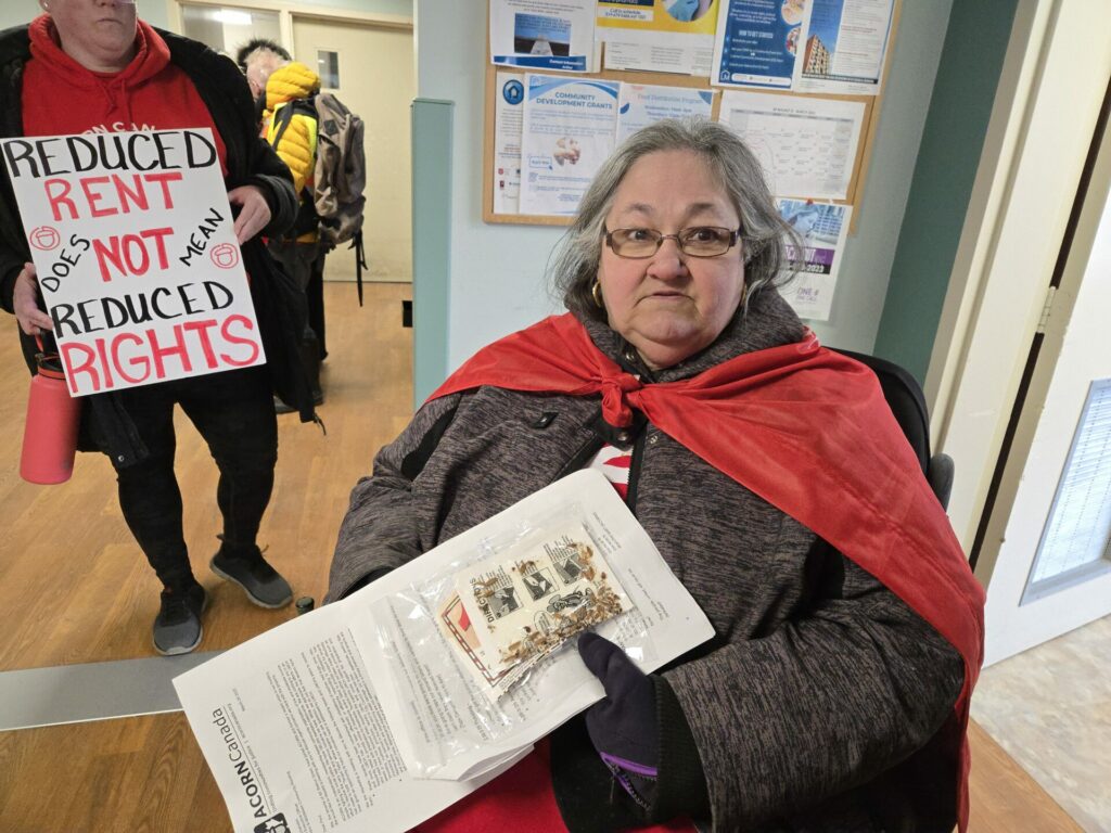 Tenant Union leader Sharon Villeneuve then highlighted the litany of issues tenants are experiencing in the building, and the hypocrisy of the city to not follow their own standards – “LMCH is City-Run housing, and you would expect the city would be setting the standard when it comes to tenant care!” ACORN members Linda Thompson and Lorraine Tauson also shared their stories of maintenance neglect from LMCH.