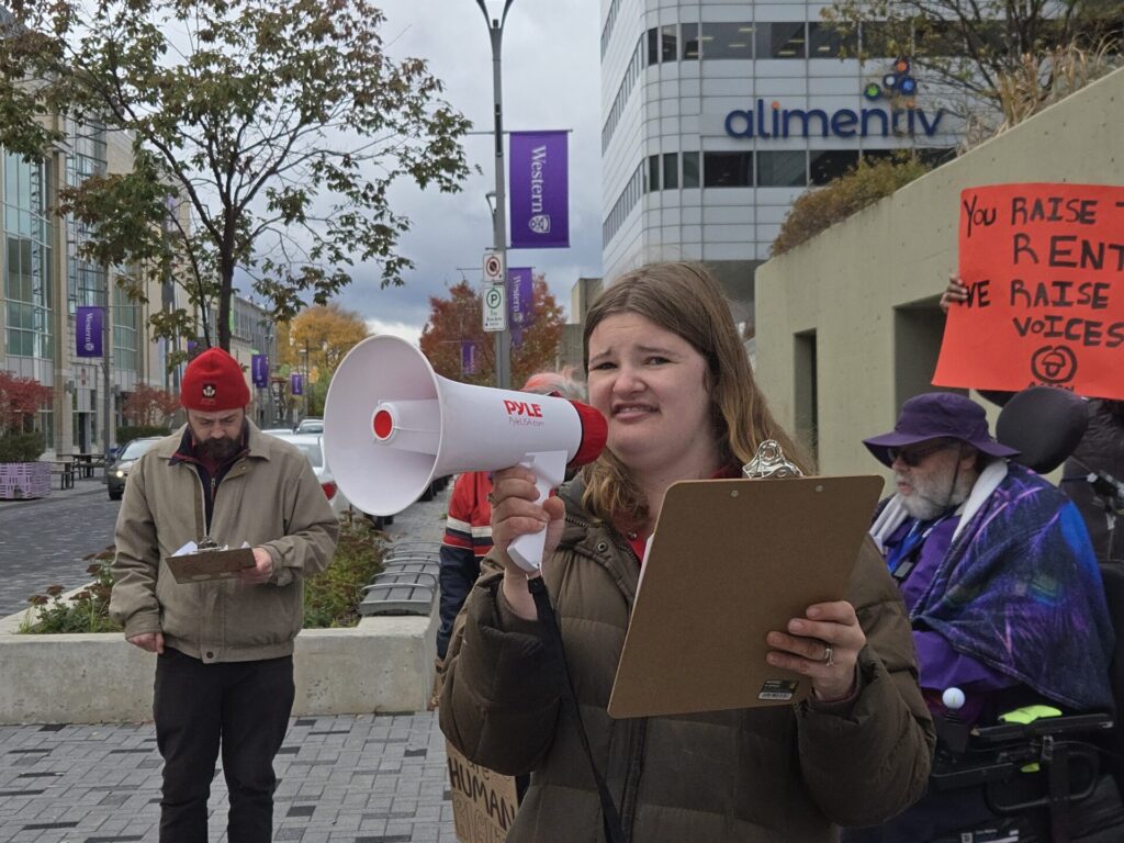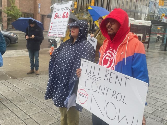 ACORN members and allies from Horizon Ottawa and Community Legal Services rallied in the rain at the Human Rights Monument to denounce Bill 60 as a gift to greedy landlords. Speakers reminded the crowd that tenants have power — and when we organize, we win. Housing is a human right!