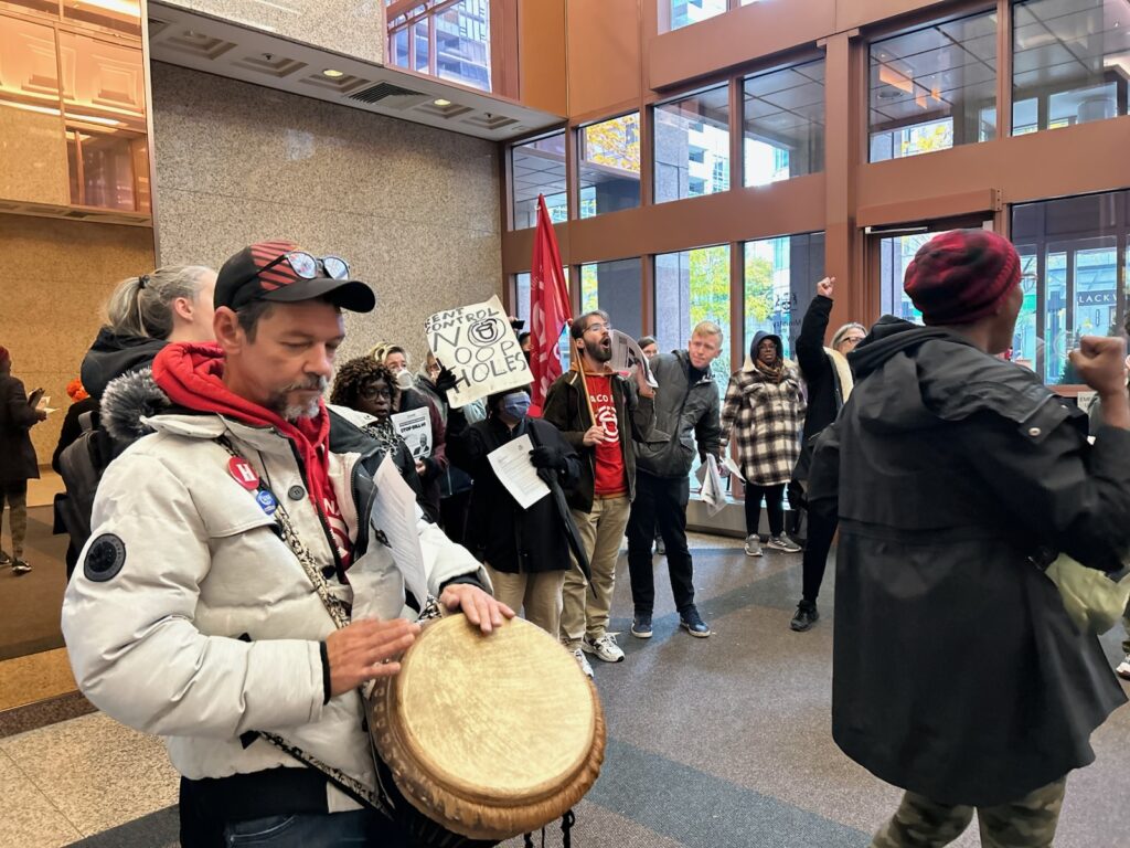35 ACORN members rallied in College Park with allies from the York South-Weston Tenant Union, FMTA and Toronto & York Region Labour Council. Members then led a march to the Ministry of Housing, where private security blocked the doors. ACORN leaders negotiated delivery of a demand letter to the 14th floor then moved on to the Ministry of the Attorney General where we took over the lobby. Leaders, Stacey Semple and Marcia Stone, successfully delivered the demand letter after some creative persistence. The People United Will Never Be Defeated!